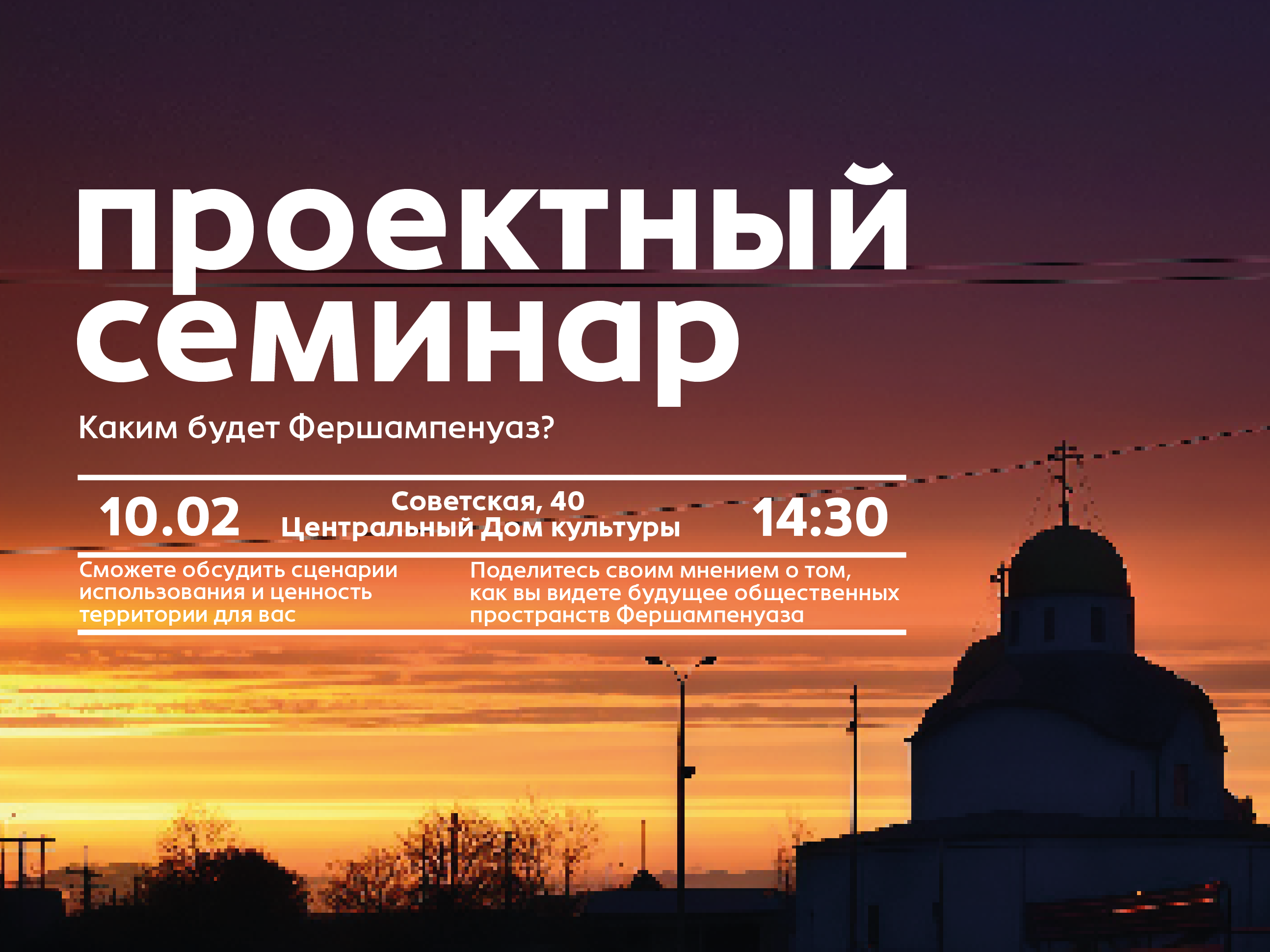 Недавно Администрация Фершампенуазского сельского поселения объявила об участии и запустила голосование за территорию. 10 февраля пройдёт проектный семинар, на котором в ходе открытого диалога станет известно, какие смыслы вкладывают жители в территорию. Разработкой концепции проекта будет заниматься Архитектурное бюро КОД в сотрудничестве с Региональным центром компетенций.
